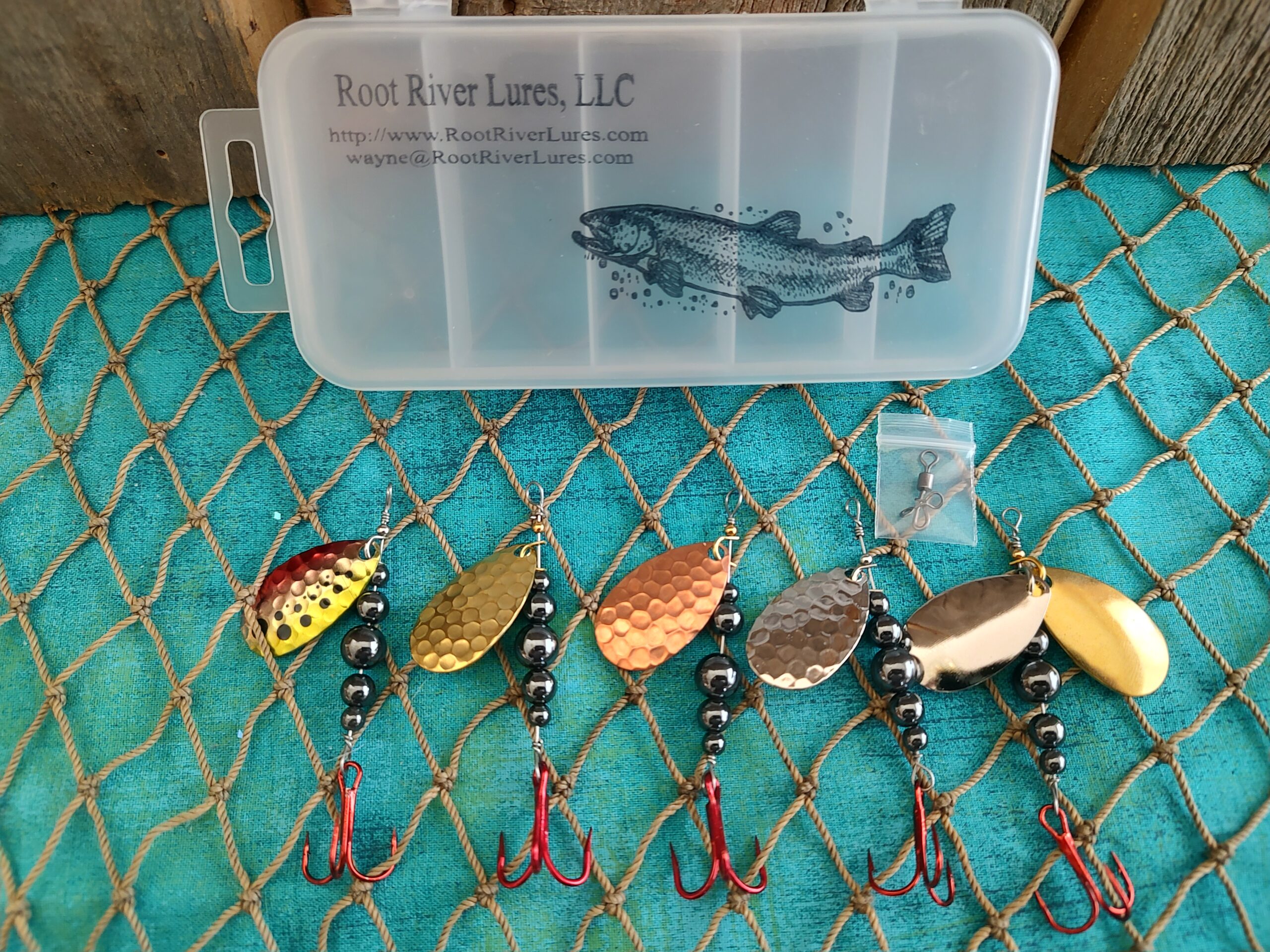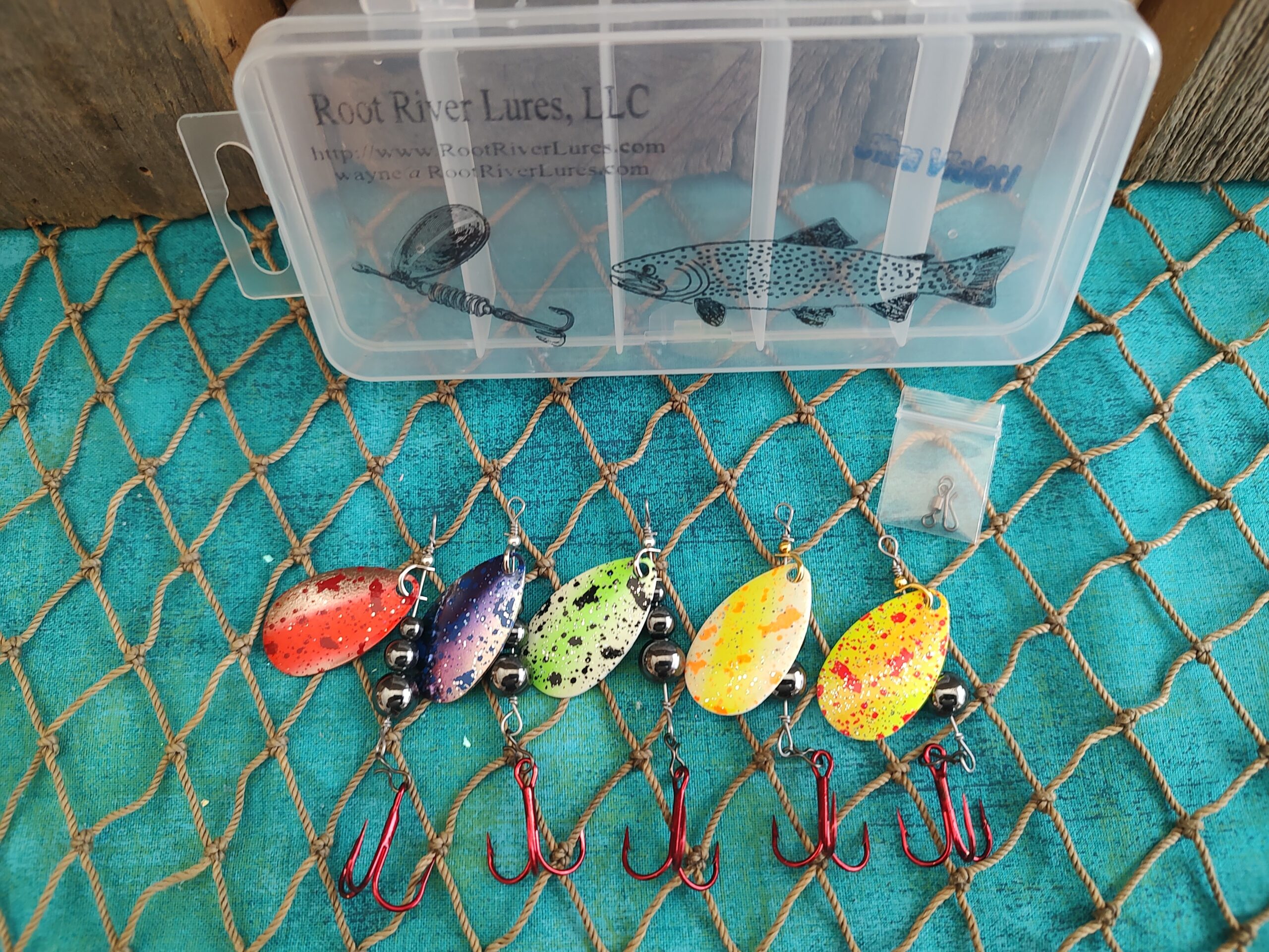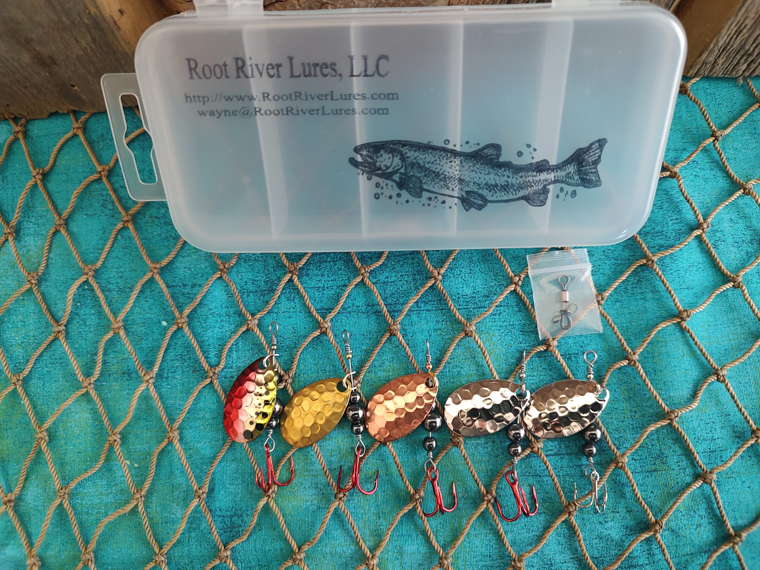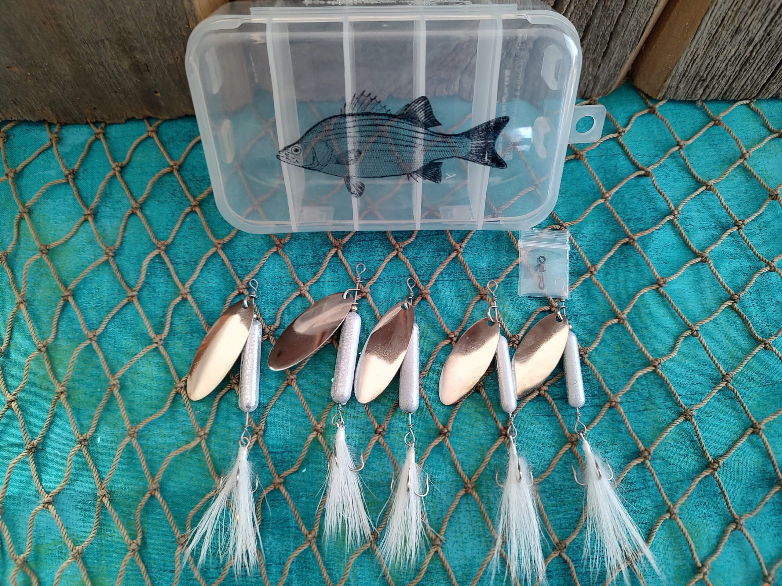 Box of 5 Swisher Blade Spinners. Includes tackle box and a snap swivel: