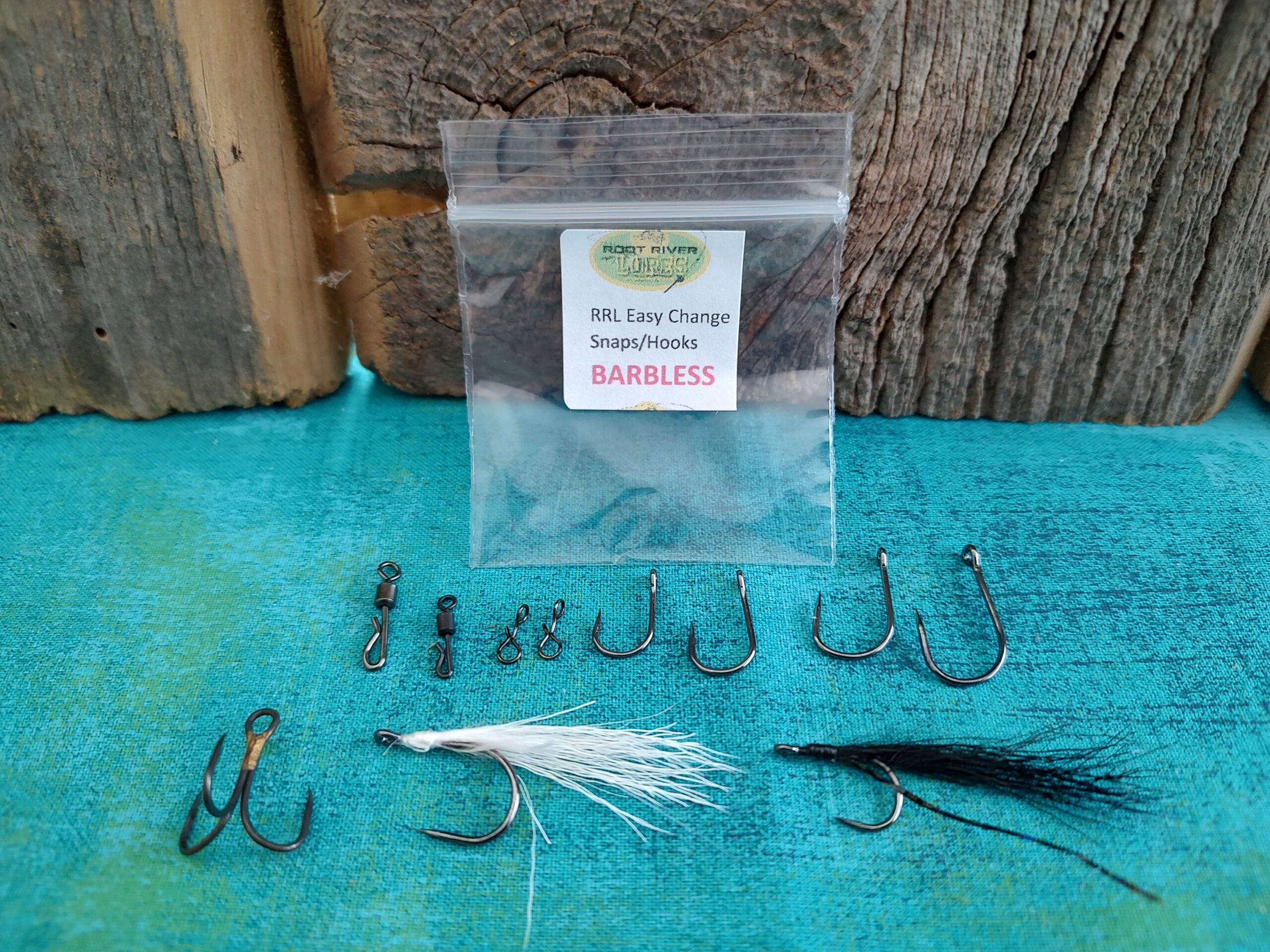 These hooks can be used to transform our Root River Lures Quick Change Inline Spinners into barbless lures.
